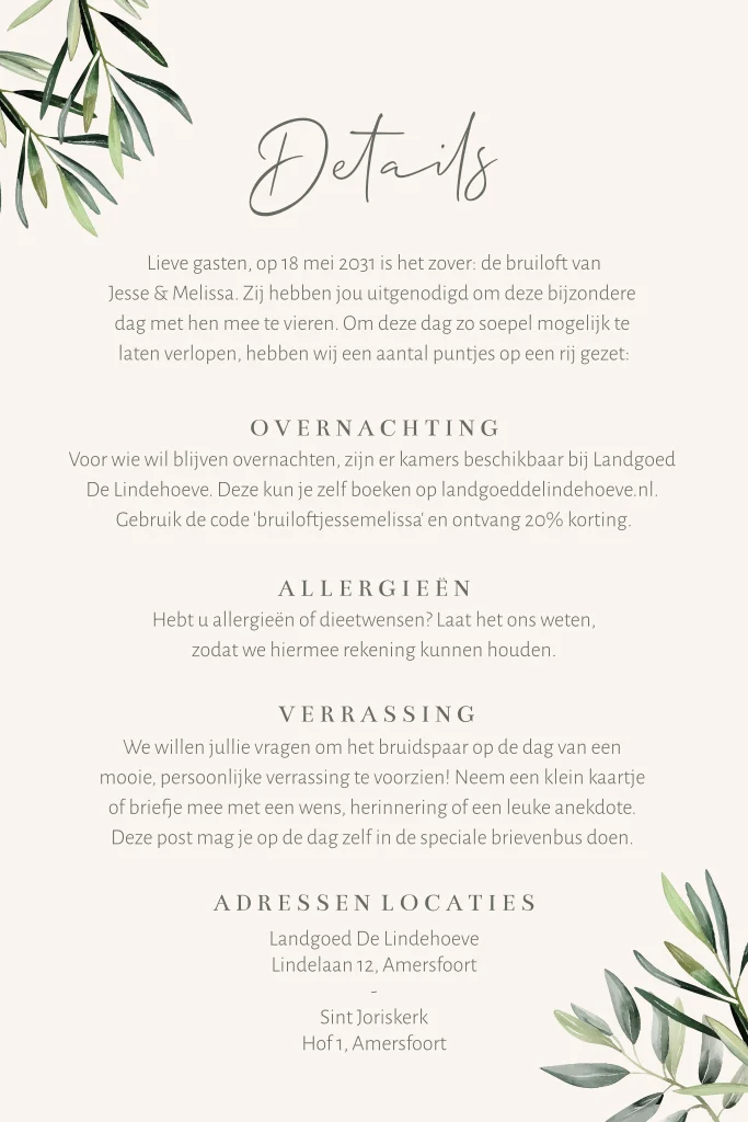 Handig en stijlvol: deze extra informatiekaart is ideaal om alle praktische details van jullie bruiloft te delen. Voeg deze kaart toe bij een trouwkaart uit de Olive Garden trouwhuisstijl en maak jullie trouwuitnodiging helemaal compleet. Zo ontvangen gasten alle informatie in dezelfde mediterrane stijl.