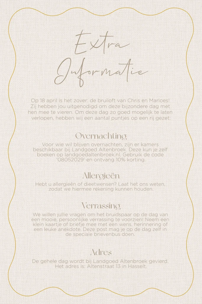 Deze extra informatiekaart in linnenlook met elegante golfrand is de perfecte aanvulling op jullie trouwkaart. Handig voor het delen van praktische details zoals routebeschrijving, hotelinformatie of cadeautips. Het natuurlijke ontwerp past naadloos bij een moderne, stijlvolle bruiloft. Combineer met de Pure Linen trouwkaarten voor een compleet geheel.