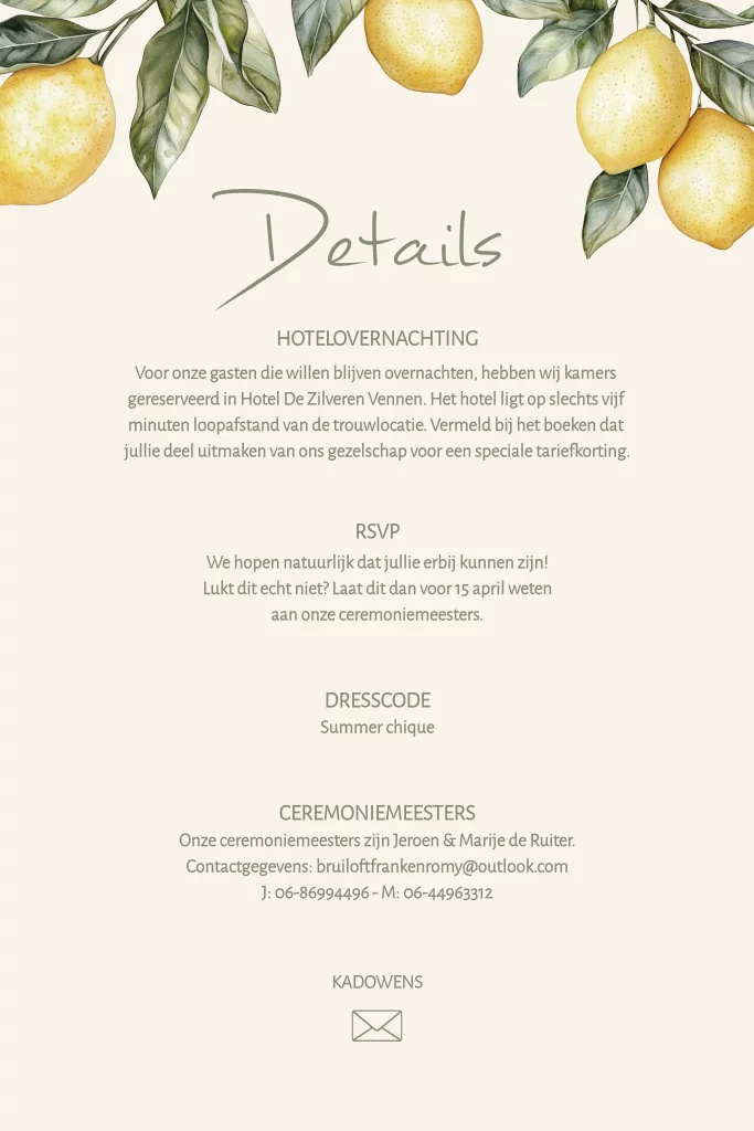 Deze kaart met extra informatie is niet alleen erg handig, maar ook nog eens hartstikke vrolijk. Een leuke toevoeging aan jullie trouwkaart in de trouwhuisstijl Lemon & Leaf.