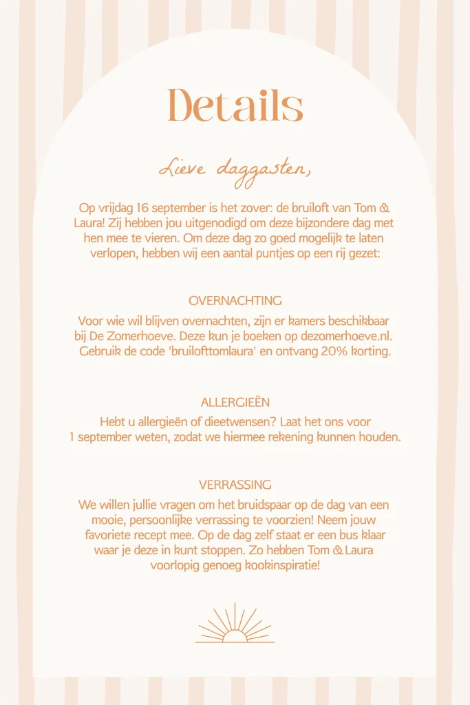 Met dit handige informatiekaartje zijn jullie gasten van alle informatie voorzien. Zo hou je je trouwkaart ook rustig en overzichtelijk. Combineer dit extra informatie kaartje met een trouwkaart uit de Trouwhuisstijl Pastel & Peach.
