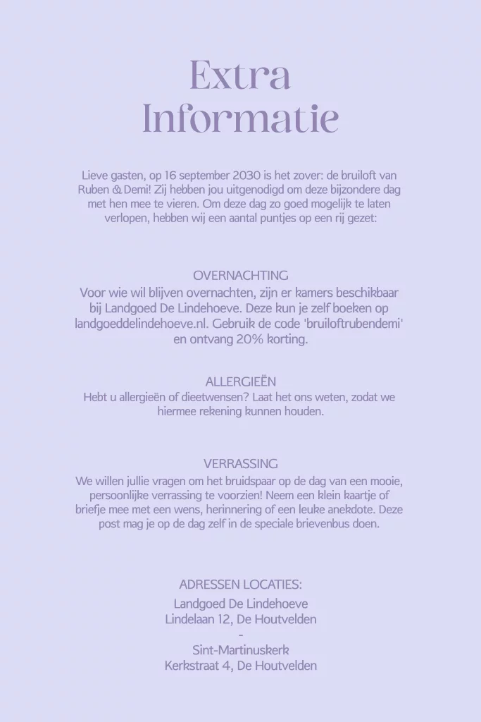 Met deze informatiekaart maak je een kaartje met veel tekst toch erg gezellig! Liever een andere pastelkleur uit de trouwhuisstijl Pastel Allure? Pas de kleuren eenvoudig zelf aan in de handige editor.