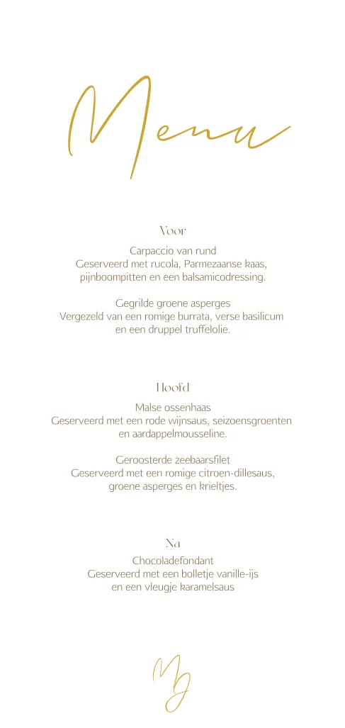 Dit menukaartje is door zijn langwerpige formaat geschikt om de tafel mee te stylen. Zo gaat jullie dinertafel er nog sjieker uit zien! Maak de menukaart extra persoonlijk met jullie initialen.