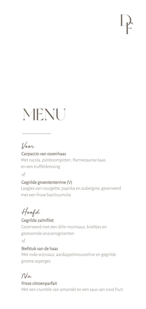 Droom jij ook van een mooi gestylde dinertafel op jullie bruiloft? Dan mogen deze menukaarten zeker niet ontbreken. De initialen voegen een persoonlijk tintje toe, waardoor het een uniek en memorabel element wordt voor jullie speciale dag.