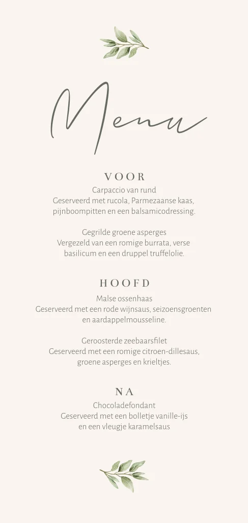 Deze offwhite menukaart met blaadjes past perfect bij de tafelaankleding van jullie bruiloft. Het elegante ontwerp uit de Olive Garden trouwhuisstijl brengt een natuurlijke en stijlvolle sfeer aan tafel. Zo genieten jullie gasten niet alleen van het diner, maar ook van de prachtige presentatie.