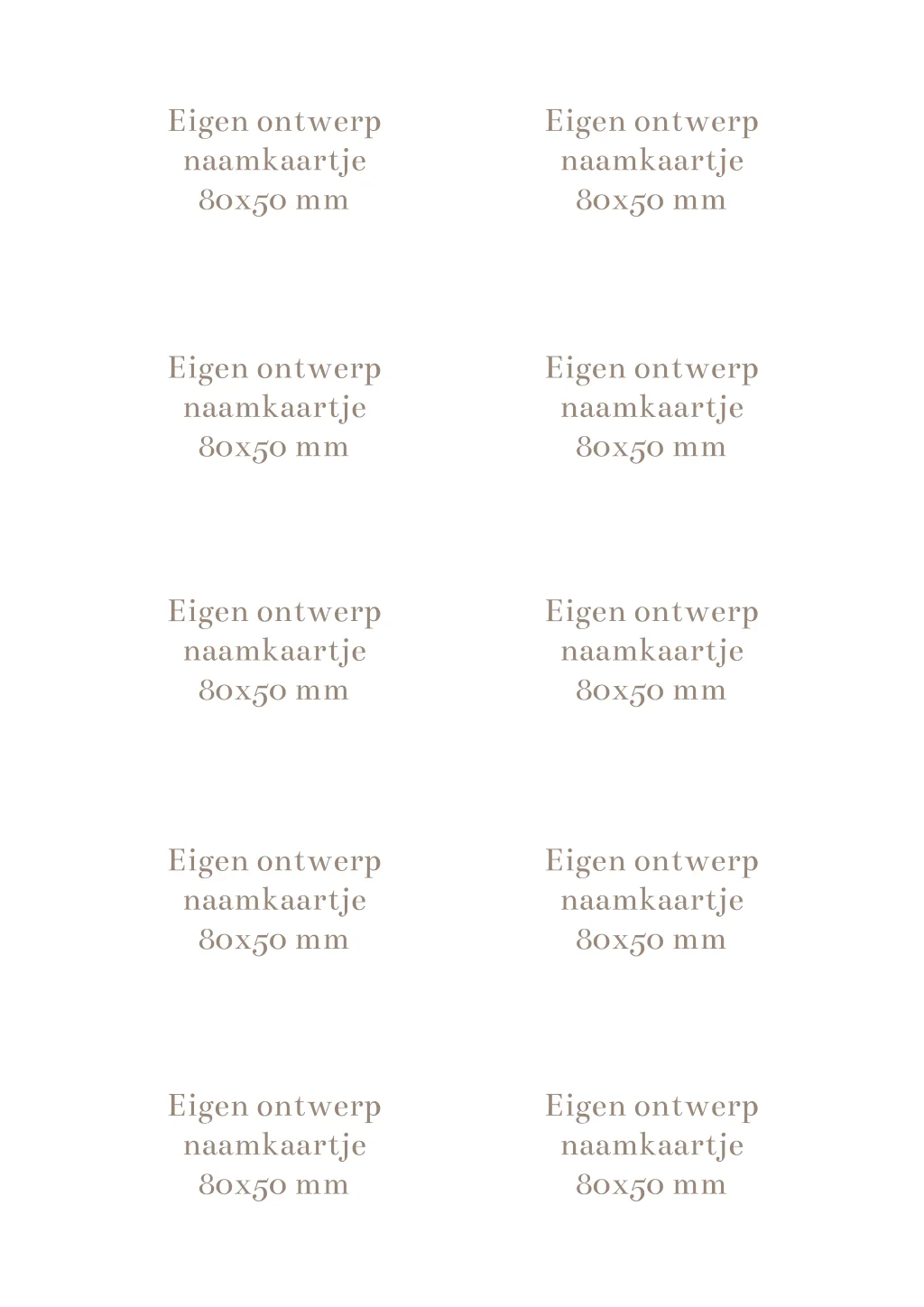 Ontwerp eenvoudig je eigen naamkaartjes van 80x50 mm in jullie trouwhuisstijl. Bij ‘Opties selecteren’ kies je uit 1 tot en met 6 vellen, waarbij elk vel 10 naamkaartjes bevat. Daarnaast kun je hier een keuze maken tussen rechte of ronde hoeken, zodat de kaartjes perfect aansluiten bij jouw stijl. De naamkaartjes worden enkelzijdig bedrukt en maken de tafelstyling helemaal af.