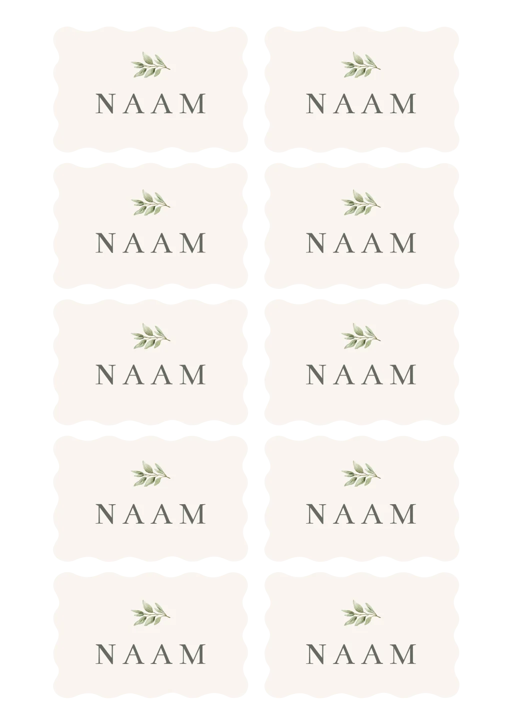 Deze naamkaartjes met golfrand en olijftakje (80x50 mm) zijn ontworpen in de stijl van de Olive Garden trouwhuisstijl en geven jullie tafel een mediterrane en natuurlijke uitstraling. Ze zijn perfect te gebruiken als plaatskaartjes tijdens een bruiloft of diner en worden dubbelzijdig bedrukt voor een luxe afwerking. De naamkaartjes zijn verkrijgbaar per set van 10 stuks en combineren mooi met de bijpassende trouwkaart en ander bruiloftsdrukwerk.