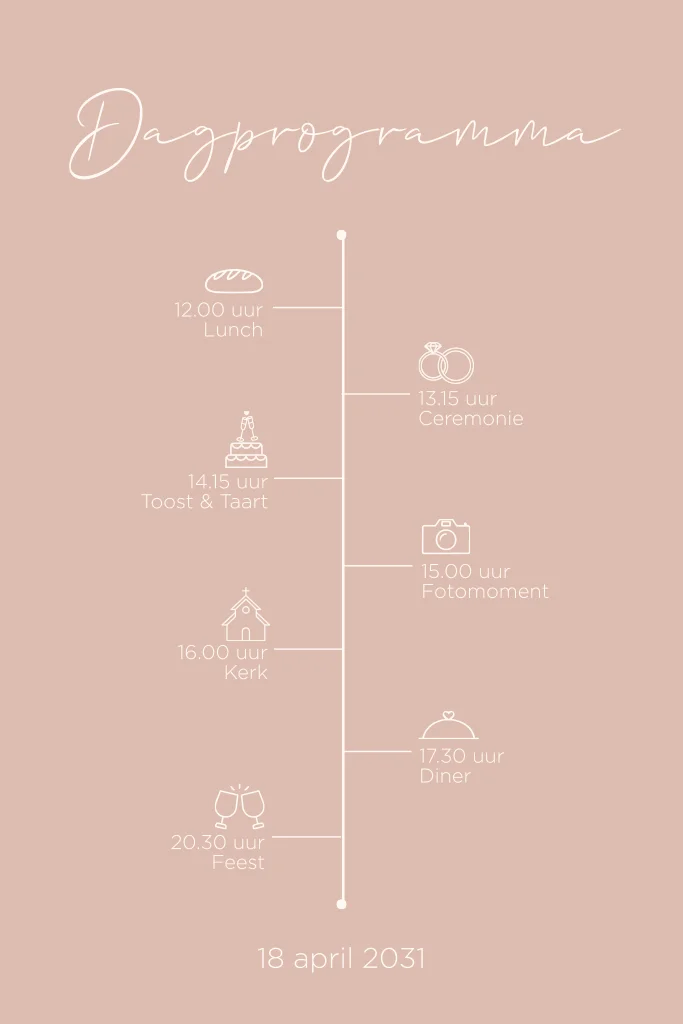Houd gasten op de hoogte van de planning met deze roze programmakaart, voorzien van een tijdlijn en duidelijke iconen. Het overzichtelijke ontwerp maakt het programma van jullie dag in één oogopslag duidelijk. De zachte roze kleur geeft een romantische en moderne touch. Perfect te combineren met de Pure Linen trouwhuisstijl.
