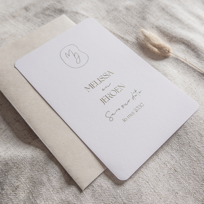 Deze luxe Save the Date kaart heeft een beige kleur met goudfolie. Jullie initialen staan in een organische vorm, waardoor deze kaart trendy is.