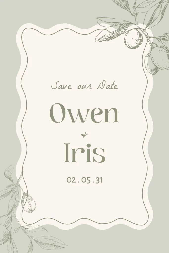Deze stijlvolle save the date in zachte saliegroen tint straalt rust en sfeer uit. De botanische details en het elegante lettertype zorgen voor een luxe en mediterraanse sfeer. Een perfecte keuze voor koppels die houden van natuur, eenvoud en verfijning. Verstuur jullie trouwdatum in stijl.