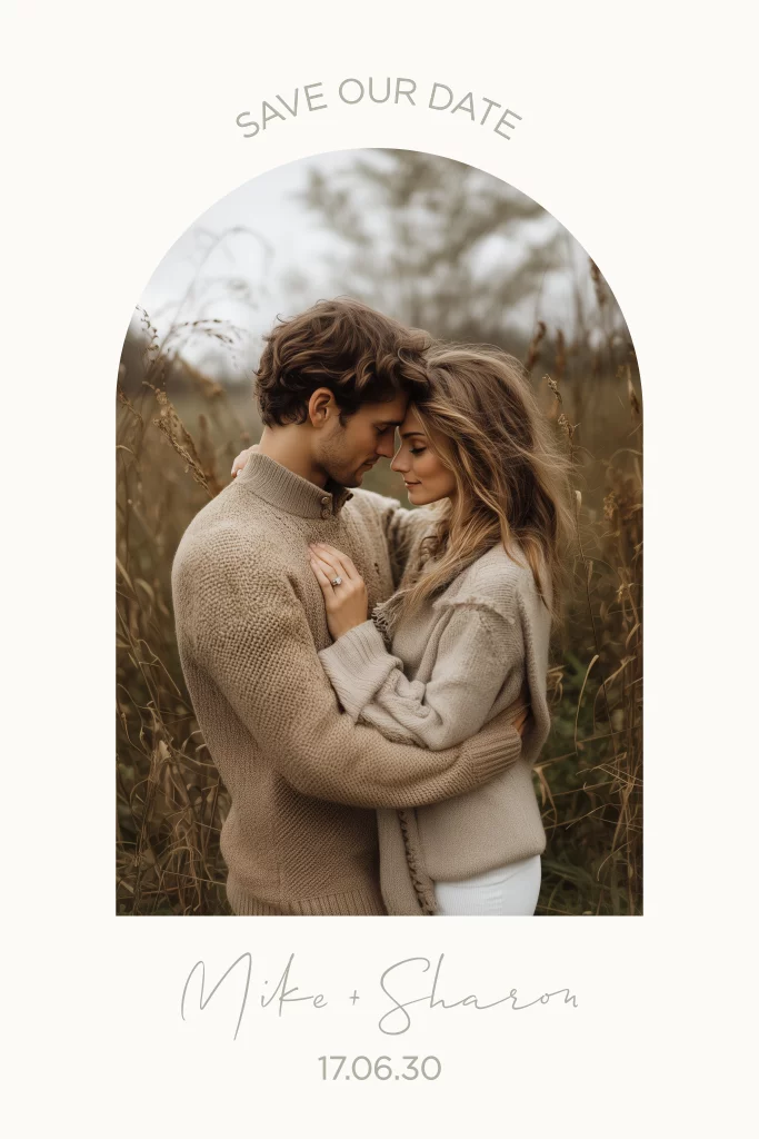 Stuur jullie save the date kaarten met een foto van jullie. Misschien heb je wel een loveshoot gedaan of heb je een andere foto die hier geschikt voor is. Plaats de foto in de boogvorm en stuur de kaart naar jullie gasten.