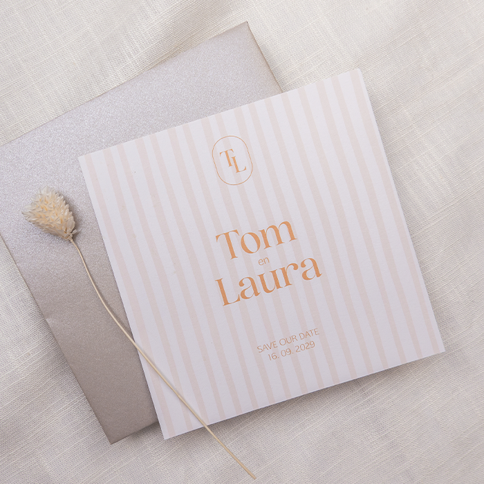 Combineer de hippe streep print met de peach oranje kleuren. Zo krijgt jullie save the date kaart een zomerse uitstraling. Laat jullie gehele trouwhuisstijl op deze vrolijke kaart aansluiten.