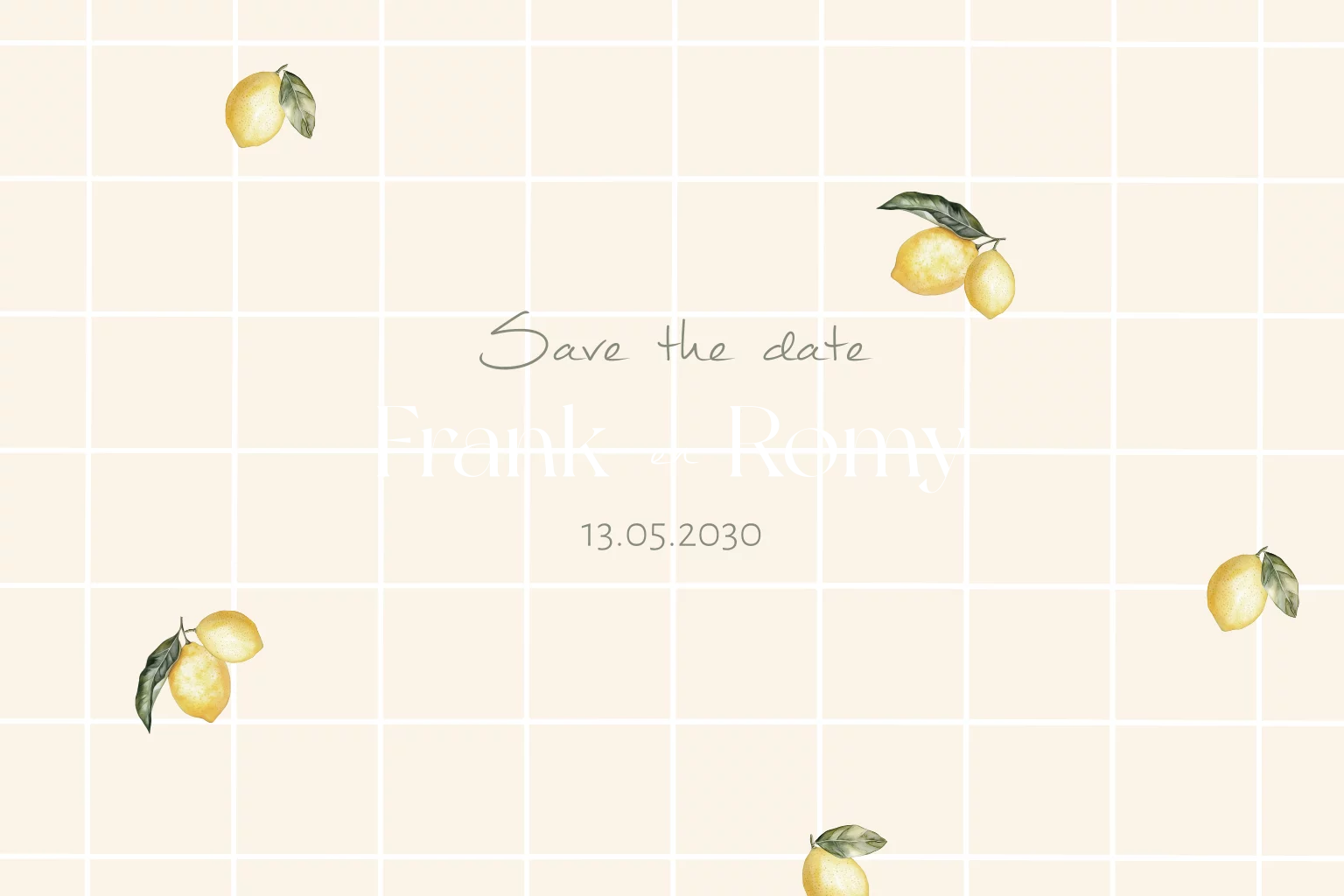 Met deze Save the Date kaart kondigen jullie op een unieke en frisse manier jullie trouwdatum aan. Met een stoer rasterpatroon en speelse citroenen, straalt deze kaart vrolijkheid en elegantie uit. Maak jullie trouwhuisstijl compleet met een trouwkaart in de trouwhuisstijl Lemon & Leaf.