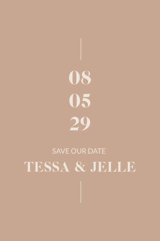 Een stijlvolle Save the Date kaart in een rustgevende camelkleur met een minimalistisch en typografisch ontwerp. Deze Save the Date kaart is geschikt voor elk seizoen en thema voor jullie bruiloft. Maak jullie trouwhuisstijl compleet met de andere kaarten uit de Desert Waves lijn.