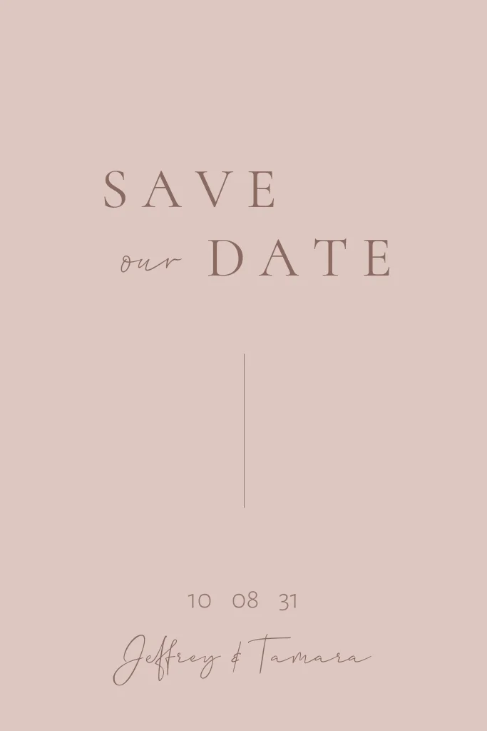 Deze typografische save the date kaart combineert modern design met een warme oudroze kleur. De nadruk ligt op de tekst, wat zorgt voor een krachtige en eigentijdse uitstraling. Ideaal voor een stijlvolle bruiloft. Maak hem persoonlijk met jullie eigen woorden.