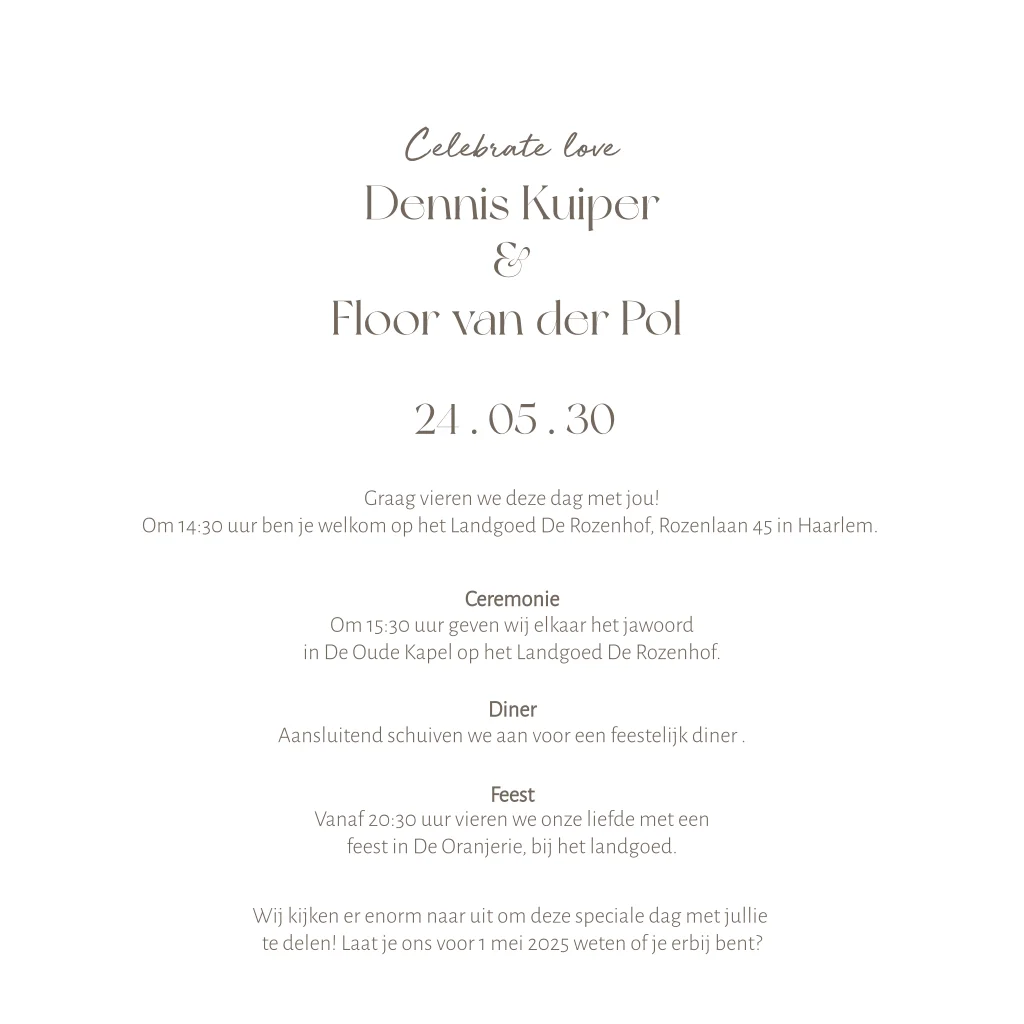 Of je nu houdt van klassiek of modern, deze trouwkaart past bij veel verschillende stijlen. De minimalistische trouwkaart maak je persoonlijk door jullie eigen initialen toe te voegen. Deze initialen kun je laten terugkomen in de gehele trouwhuisstijl Pure Essence.