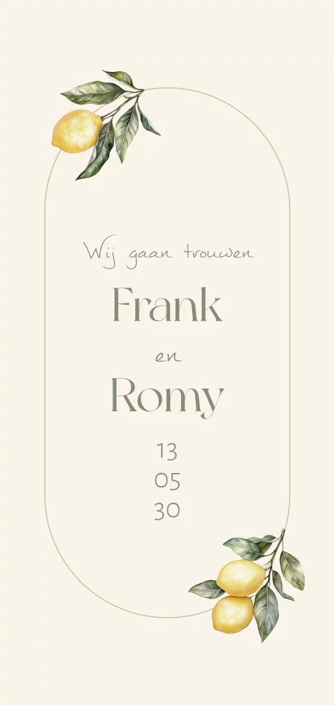 Op zoek naar een trouwkaart met een botanisch tintje? Deze trouwkaart heeft botanische illustraties van citroenen, waardoor deze kaart perfect bij een lente- of zomerbruiloft past. Pas het programma op de kaart naar wens aan. Zo hebben de gasten een duidelijk overzicht wanneer ze waar verwacht worden.