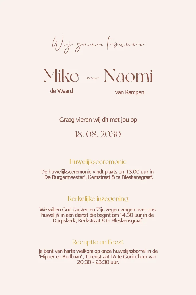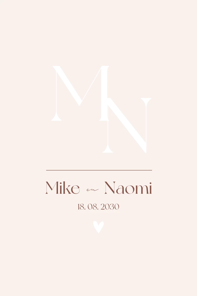 Deze trouwkaart ademt elegantie met initialen als middelpunt en een verfijnde goudfolie afwerking. Een perfecte match voor een klassieke of luxe bruiloft. De combinatie van typografie en glans maakt dit ontwerp tijdloos en bijzonder. Pas hem eenvoudig aan naar jullie eigen stijl.