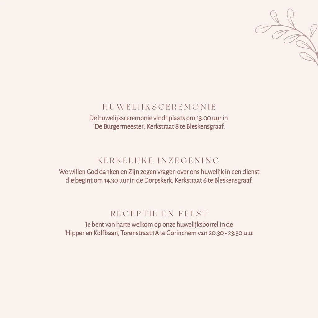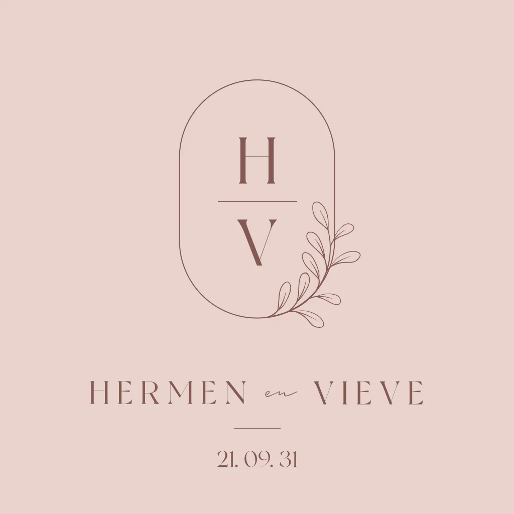 Deze zacht roze trouwkaart in combineert een persoonlijk monogram met een subtiele illustratie van een takje. De Soft Botanics stijl zorgt voor een botanische en tijdloze uitstraling. Ideaal voor stellen die een natuurlijke bruiloft plannen.